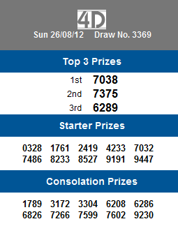4D,1+3D and 6D Result As Of 25th August 2012